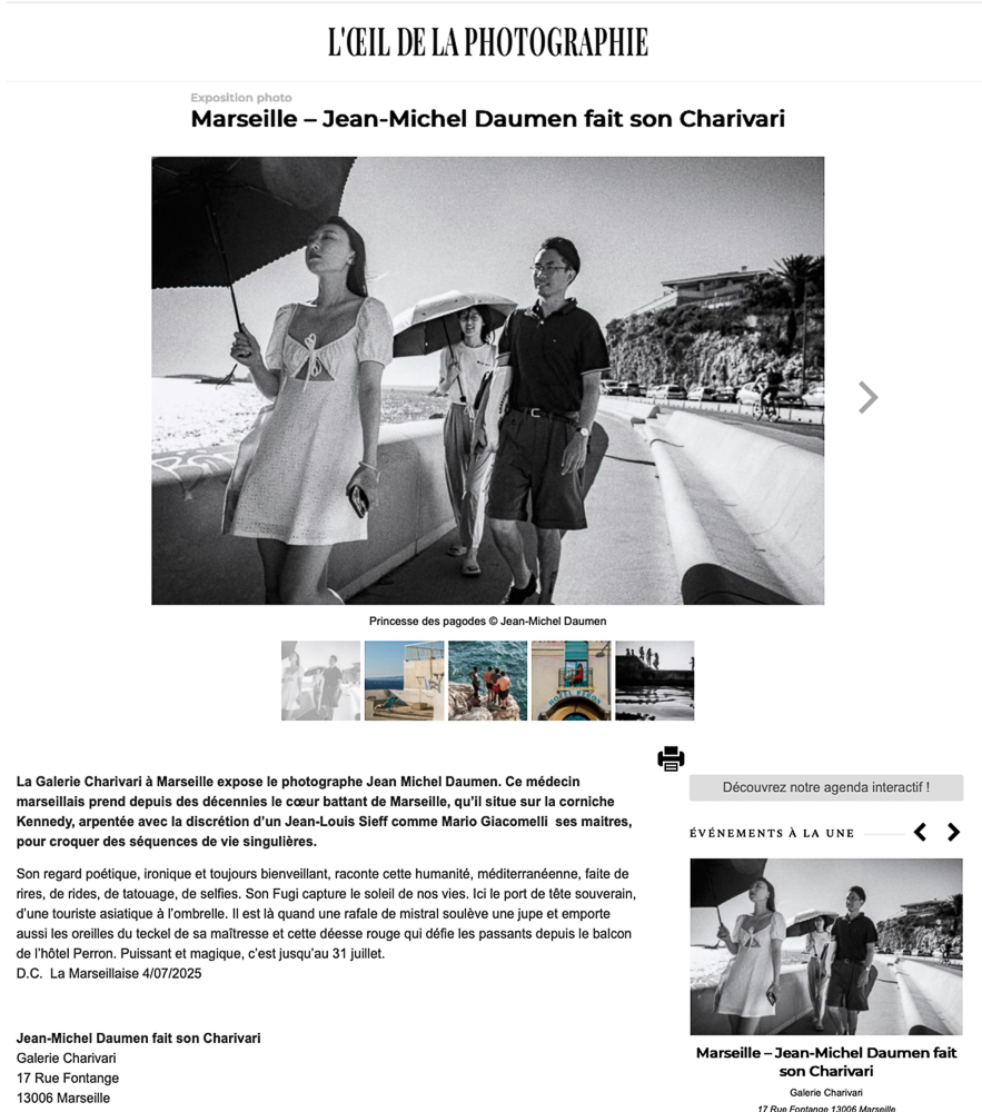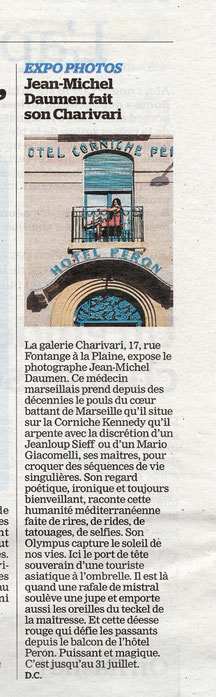 C'est grâce à la bienveillance de Muriel Feugère, qui a mis à ma disposition sa galerie, à l'aide de Lou ma femme qui m'a accompagné dans le travail de préparation, et au coup de main de mon vieil ami Hubert pour l'installation que cette expo a pu se tenir de juin à fin juillet 2025. Je suis né ici dans l'eau, pourrait-on dire. J'ai besoin tous les jours de verifier que la mer est bien à sa place, et je prends des photos . Donc la mer, les passants qui passent, les baigneurs, les bronzeurs, les coureurs les marcheurs et les autres accompagnent ce charivari marseillais. Pour les curieux , ce qu'en dit la presse c'est en bas de page.