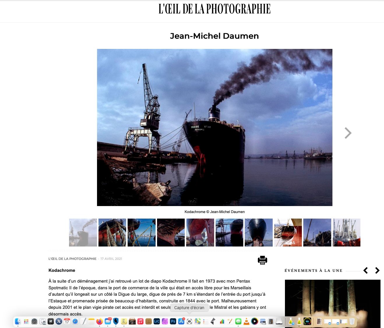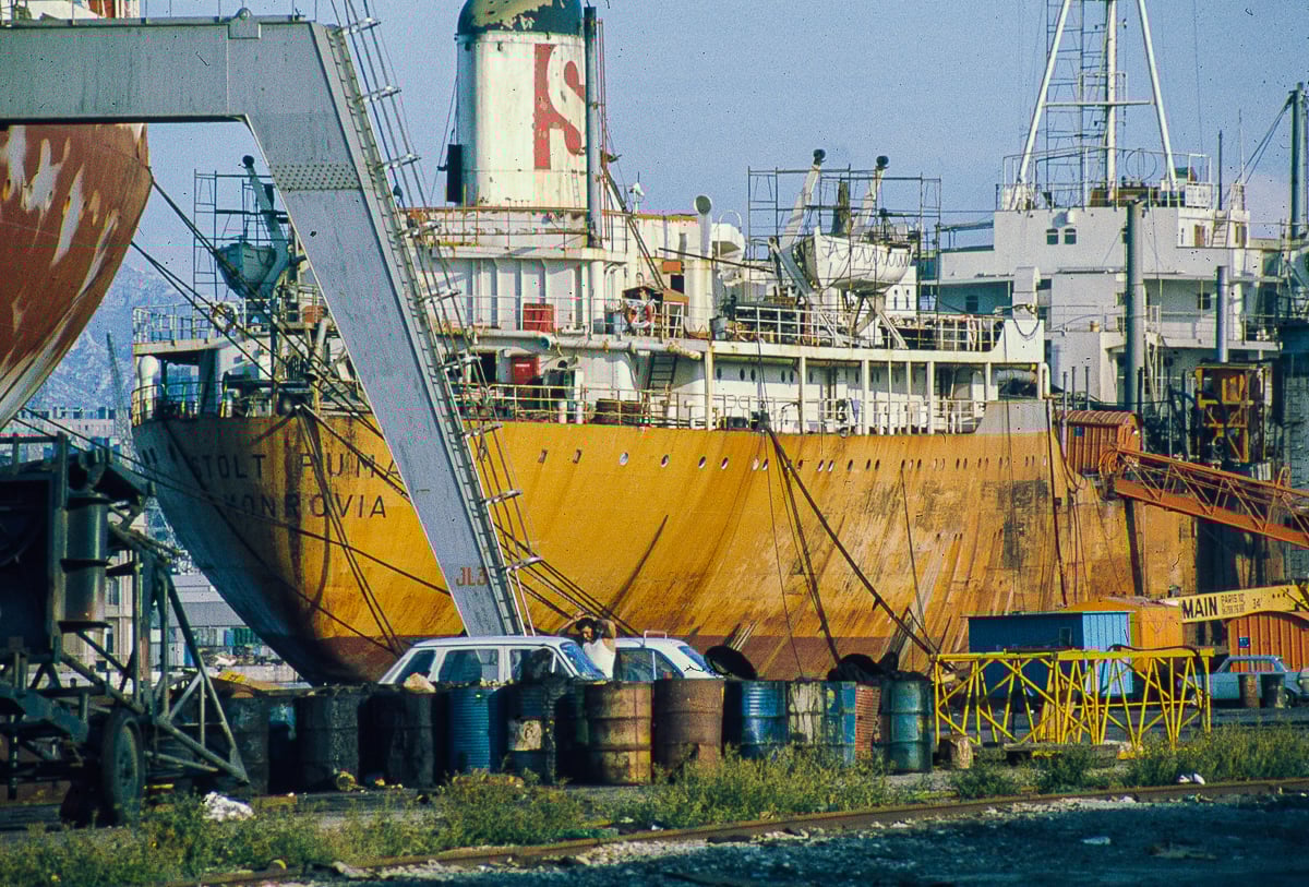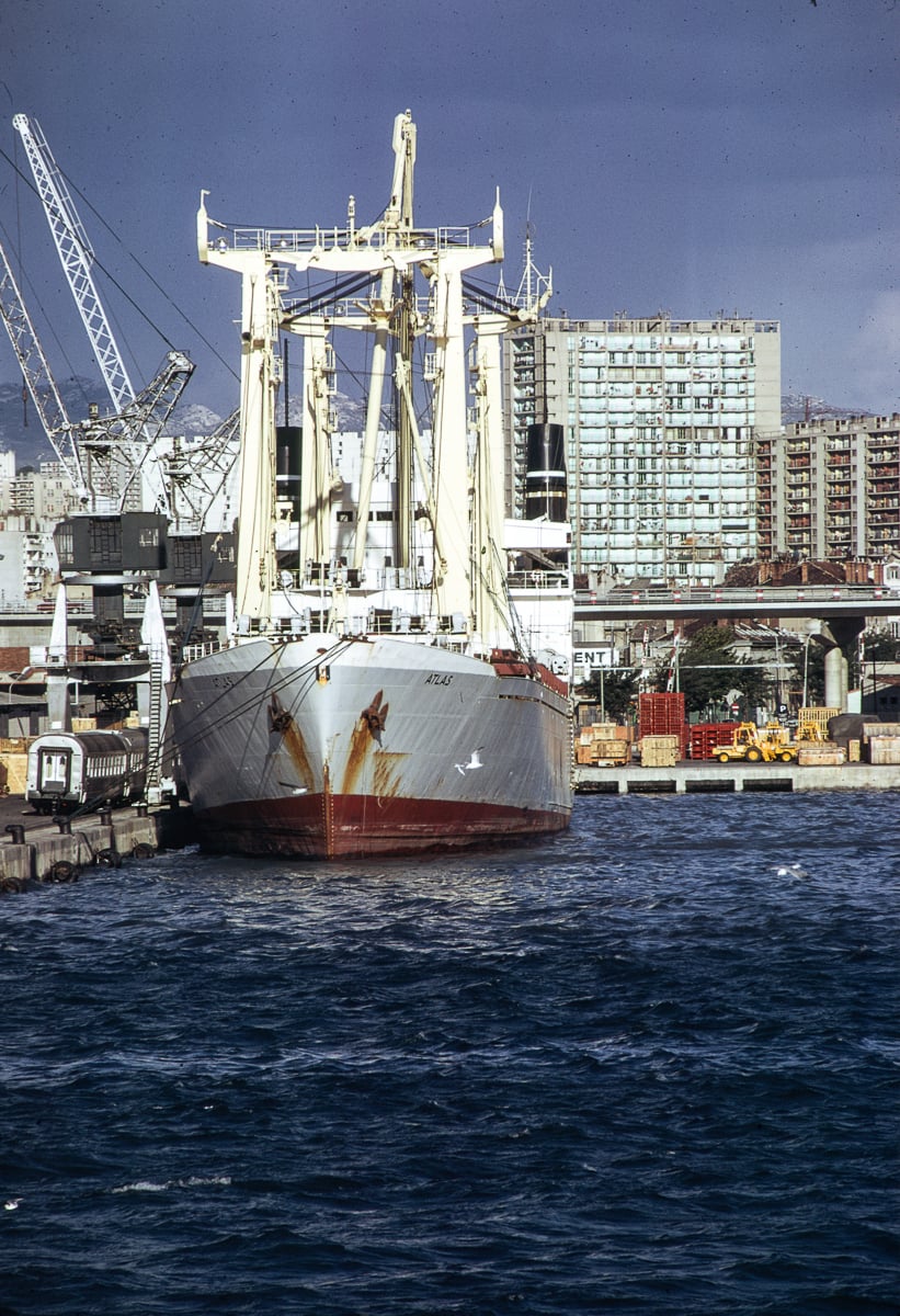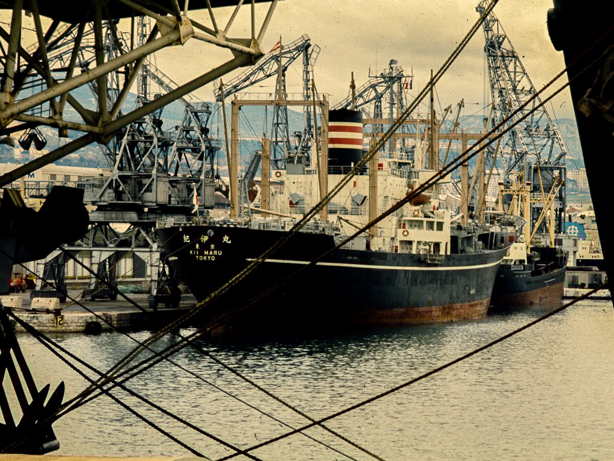 À la suite d’un déménagement j’ai retrouvé un lot de diapo Kodachrome II fait en 1973 avec mon Pentax Spotmatic II de l’époque , dans le port de commerce de la ville qui était en accès libre pour les Marseillais d’autant qu’il longeait sur un côté la Digue du large, digue de prés de 7 km s’étendant de l’entrée du port jusqu’à l’Estaque et promenade prisée de beaucoup d’habitants, construite en 1844 avec le port. Malheureusement depuis 2001 et le plan vigie pirate cet accès est interdit et seuls les professionnels, le Mistral et les gabians y ont désormais accès.